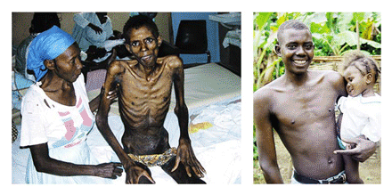 The picture is of a Haitian man with HIV and TB who was (and presumably still is) a patient in the Partners in Health clinic in central Haiti. The left is a "before" image, when he was sick with HIV and TB. The right side is the "after" image, taken just six months later, after he was treated for TB and started on antiretrovirals (ARVs). I generally show this picture to patients before starting them on ARVS. I think it expresses the power of ARV treatment better than any speech I could come up with.